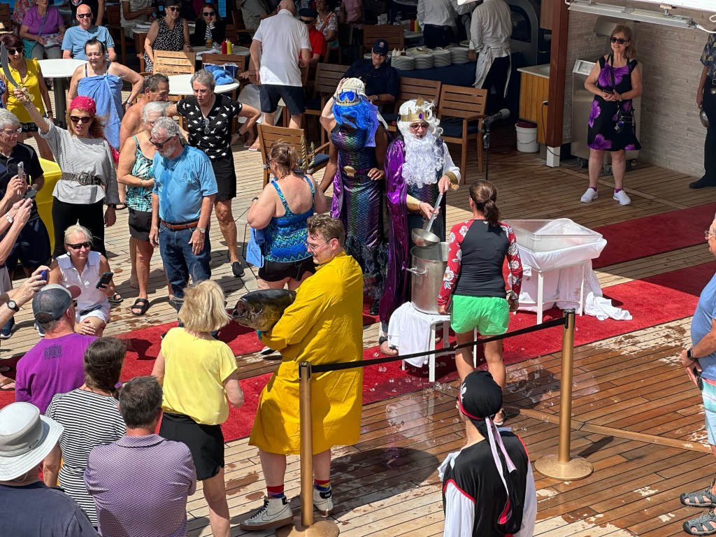 Yes, it is true. I have been a happy little Pollywog all of my life. Today, I realized that the preferred status is a Shellback. You can only achieve this if you have crossed the equator in a sea sailing vessel. A Neptune-like substitute (see below) ordained that at 10:45 pm we will convert to a Shellback. There was a ceremony that involved kissing a fish and being drenched with water. Not really my cup of tea. Anyway, fun had by all.