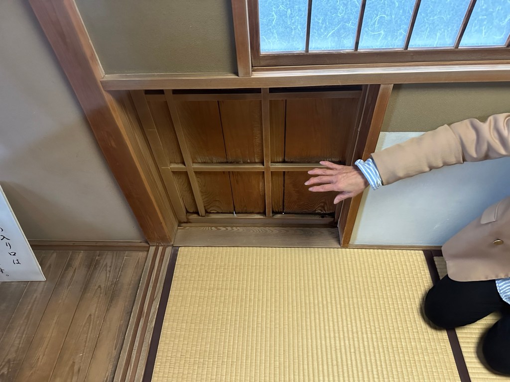 Traditionally, visitors would enter the tea house through a small entry. All guests were prohibited from bringing weapons into the house. This small opening helped to prevent weapons such as swords from entering.
