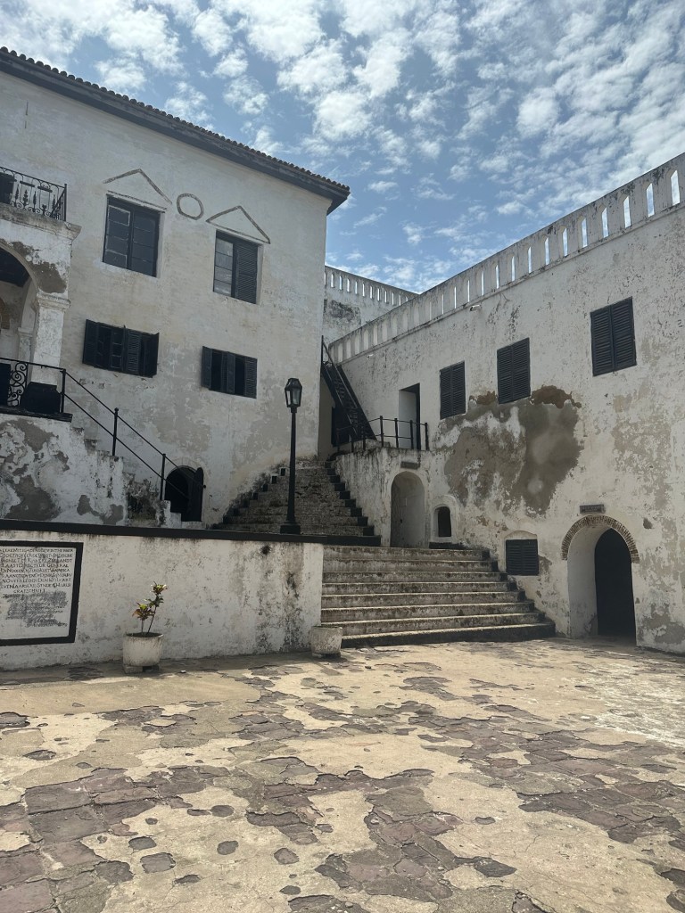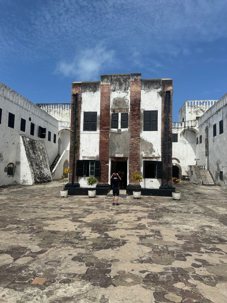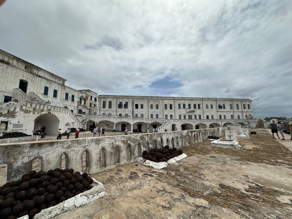 The castle was actually a fort that was started by the Portuguese and wound up in British control. Prior to the British prohibiting the slave trade in the early 1800’s, this building held up to 2,000 captured people waiting transport to Brazil, the Carribean, and the U.S. Generally, slave marketers from the local town would capture the people and sell them to the European trade dealers. As the guide readily informed us, the slave trade depended upon the support and involvement of local tribal leaders and their community.