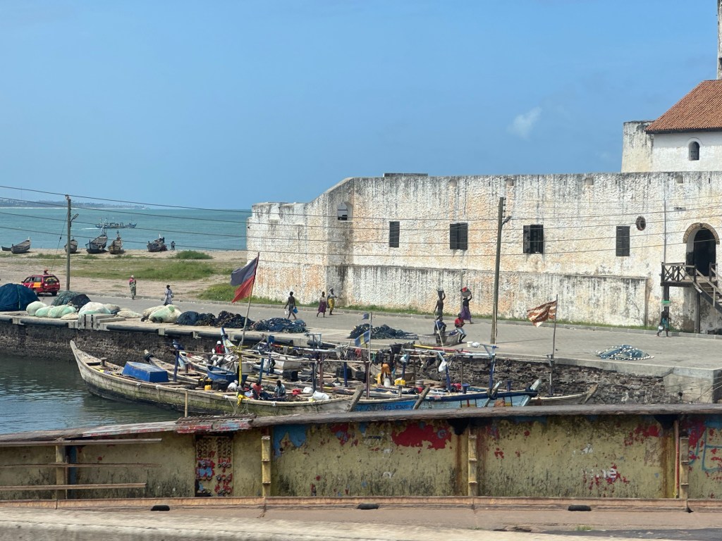 The Cape Coast Castle is located a two hour drive from the port. The coast is pretty but the struggling living conditions appear to be irreversible as they are seen from the miles of roadway that we used. Once again, we were under security supervision.