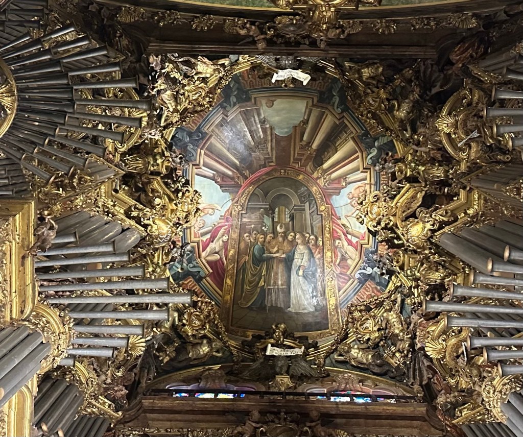 Looking to the highest ceiling with the pipes of the organ shown.